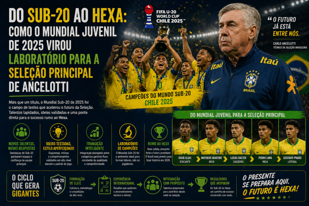 Santiago do Chile/Granja Comary — O futebol brasileiro tem um relógio próprio. E ele não marca apenas minutos. Marca ciclos. Enquanto a Seleção Principal se prepara para a Copa do Mundo de 2026 nos Estados Unidos, uma geração mais nova escreve seu próprio capítulo: o Mundial Sub-20 de 2025, disputado no Chile, funcionou não apenas como torneio de base. Funcionou como vitrine. Como laboratório. Como ponte direta para o time de Carlo Ancelotti.